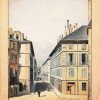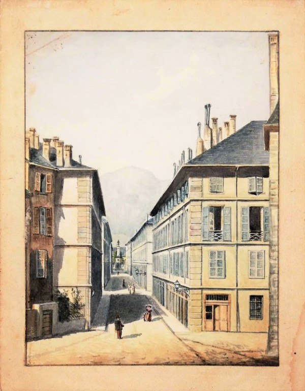 Dipinto originale eseguito ad acquerello, su carta con abili e minuziose pennellate. L'opera, di buona fattura, è lo scorcio di una cittadina non identificata. Al fondo della via si scorge un monumento oltre il quale, in profondità, si erge una montagna. Esemplare in buono stato conservativo.
