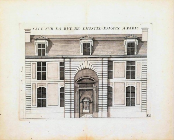 Incisione originale su matrice di rame, finemente eseguita con abile tratteggio all'acquaforte. Bella raffigurazione architettonica della facciata di un edificio francese di Parigi. Tavola tratta da opera di architettura del secolo XVIII. Esemplare in buone condizioni conservative.