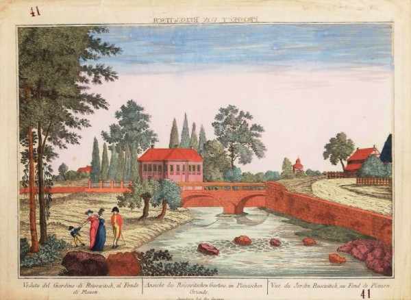 Incisione originale eseguita all'acquaforte su matrice di rame, coloritura coeva ad acquerello e tempera in più colori. In lastra, sotto la parte figurata, titolo in italiano, tedesco e francese, dati tipografici e timbro con n. 41, al margine superiore titolo in controparte, per permetterne la visione. La raccolta fu realizzata per essere vista con un apparecchio chiamato "pantoscopio", attraverso delle lenti le vedute potevano essere illuminate con candele per ottenere sia l'effetto diurno che notturno. Si potevano ammirare inoltre nelle cosiddette " boites pour optique", con questo strumento le stampe venivano riflesse in uno specchio attraverso una lente. Fra i maggiori centri di produzione delle vues d'optique vi furono, oltre a Parigi, Bassano del Grappa nel Veneto, sede della celebre stamperia Remondini, e Ausgburg. Nel corso del XVIII secolo, le "vues d'optique" o "viste prospettiche" furono estremamente popolari in Europa, sviluppando rapidamente un forte collezionismo. Le "vues d'optique" sono state un potente mezzo per divulgare la conoscenza delle città del mondo al vasto pubblico che non poteva permettersi di viaggiare. Gli artisti e incisori che hanno creato queste stampe raramente erano a conoscenza di prima mano delle scene raffigurate, pertanto, i panorami erano spesso non accurati. La stampa in esame ripropone la bella vista sul Reisewitzschen Garden, un ex parco nell'odierno quartiere Löbtau di Dresda, con personaggi in costumi d'epoca e animali che animano la scena. Esemplare in buono stato conservativo.