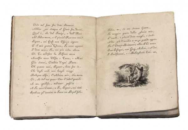 Legatura originale in cartone spruzzato di rosso; al dorso, rinforzo di carta marmorizzata settecentesca apposto a ricoprire le mancanze, evidenti segni di consunzione, traforo di tarli al piatto anteriore, scoloriture. 8 pagine non numerate, compreso frontespizio con elegante vignetta incisa (al verso ex-libris incollato di Guido Armanu), alla settima pagina altra elegante vignetta incisa e firmata Oveline?, 68 pagine numerate, di cui l'ultima carta con numerazione errata per gli indici. Brooks "Charmante impression très rare- Geering". Esemplare da studio, numerosi piccoli forellini di tarlo o minuscole traforature degli stessi, lieve ingiallimento alla parte interna praticamente a tutte le carte.