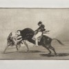 Incisione originale eseguita all' acquaforte, acquatinta, puntasecca e bulino, in inchiostro color seppia, impressa su carta vergata. La lastra originale è conservata presso la Calcografia Nazionale di Madrid. Bella prova proveniente dalla terza edizione della cleberrima "Tauromachia", pubblicata postuma nel 1876, la prima nel 1815-16, la seconda nel 1855; quella in esame è la prima edizione a reintegrare le 7 tavole inizialmente scartate nelle precedenti edizioni, facendone così l'edizione più completa della suite pubblicata fino ad allora, con 40 incisioni eseguite da Goya, numerate in lastra in alto a destra e impresse su bella carta vergata. In questa rara e bella silloge il grande artista spagnolo trasse l' ispirazione sia dal suo passato di torero nonché dal libro sulle corride pubblicato nel 1777 dal suo amico, il poeta Nicolas Fernandez de Moratin. Tuttavia è solo quarant'anni dopo, nel 1815-1816, che Goya condusse un lungo lavoro preparatorio per realizzare questa superba suite. Esemplare in eccellenti condizioni conservative, a pieni magini.