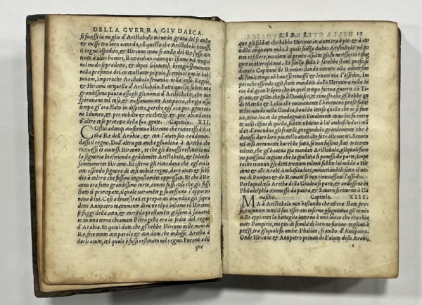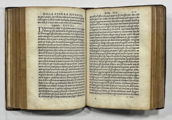 Elegante legatura veneziana coeva in piena pelle con ricche impressioni fitomorfe a secco a i piatti  con filetti, bordure e fregi; dorso a 3 nervi rilevati; restauri agli angoli con piccole integrazioni  e integrazioni al dorso che risulta ricostruito con recupero di buona parte del pellame originale. 324 carte numerate, compresi il frontespizio con titolo all'interno di raffinata edicola architettonica silografata e ampia marca silografata al verso dell'ultima carta.  Testo in volgare e carattere corsivo gotico romano.  Giuseppe Flavio, storico ebreo di lingua greca. Partecipò alla rivolta giudaica e, catturato da Vespasiano e poi liberato, ne assunse il nome Flavio. Le sue opere intendono eliminare il pregiudizio antiebraico della cultura greco-romano. Esemplare in buone condizioni complessive dalla bella legatura coeva; qualche carta lievemente arrossata.