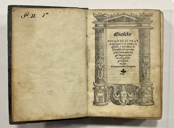 Elegante legatura veneziana coeva in piena pelle con ricche impressioni fitomorfe a secco a i piatti con filetti, bordure e fregi; dorso a 3 nervi rilevati; restauri agli angoli con piccole integrazioni e integrazioni al dorso che risulta ricostruito con recupero di buona parte del pellame originale. 324 carte numerate, compresi il frontespizio con titolo all'interno di raffinata edicola architettonica silografata e ampia marca silografata al verso dell'ultima carta. Testo in volgare e carattere corsivo gotico romano. Giuseppe Flavio, storico ebreo di lingua greca. Partecipò alla rivolta giudaica e, catturato da Vespasiano e poi liberato, ne assunse il nome Flavio. Le sue opere intendono eliminare il pregiudizio antiebraico della cultura greco-romano. Esemplare in buone condizioni complessive dalla bella legatura coeva; qualche carta lievemente arrossata.