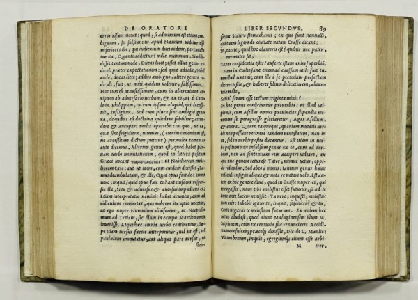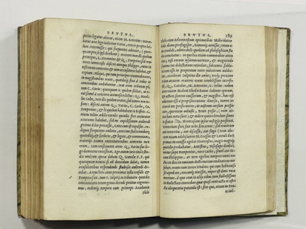 Legatura in mezza pelle e carta maculata del XVIII secolo, al dorso, autore e titolo in oro su tassello rosso, fregi in oro trasversali. 240 (i.e. 248) carte mal numerate, compreso il frontespizio con titolo e ancora aldina, antica nota manoscritta diu possesso "Franciscus Bonis".  Paulus Manuzio (1512-1574), il figlio più giovane di Aldo,  fu un editore molto influente e uno dei più importanti umanisti del tardo Rinascimento italiano. Questo è il secondo volume di tre, pubblicato separatamente, dell'Opera Rhetorica, a cura di Paulus Manutius con il testo basato sull'edizione del 1546 e corretto da Manuzio stesso. Marco Tullio Cicerone (106-43 aC) fu una delle figure più influenti dell'antichità classica, egli mise le sue capacità legali al servizio della politica con discorsi che divennero punti di riferimento dell'oratoria forense. Definita da Quintiliano come l'eloquenza stessa, la sua copiosa produzione in prosa occupò un posto fondamentale nei programmi di studio medievali. Cicerone fu uno statista, giurista e studioso romano, Il più grande oratore della tarda Repubblica. Il  volume è una notevole raccolta delle sue opere di retorica, in cui presenta i canoni di questa complessa disciplina, la sua storia e insegna come usarla. Esemplare internamente in ottime condizioni, fresco e bene impresso, la legatura presenta la riattaccatura del piatto anteriore.