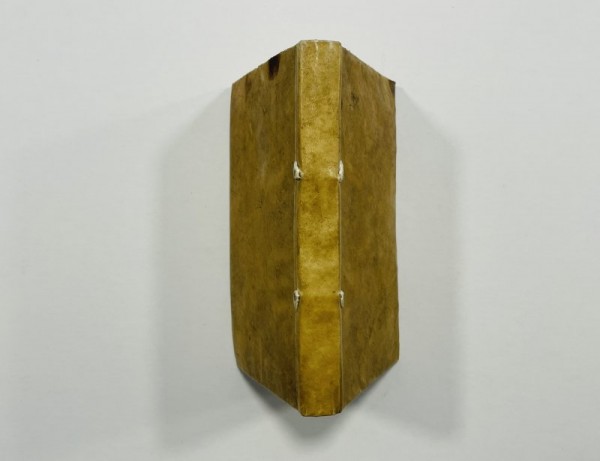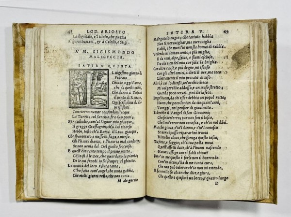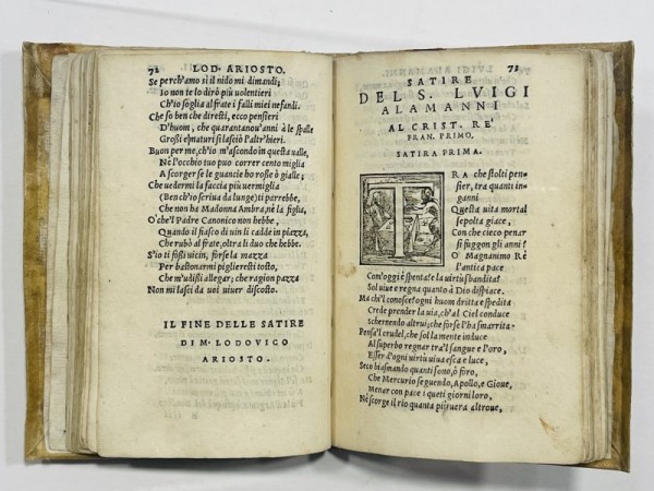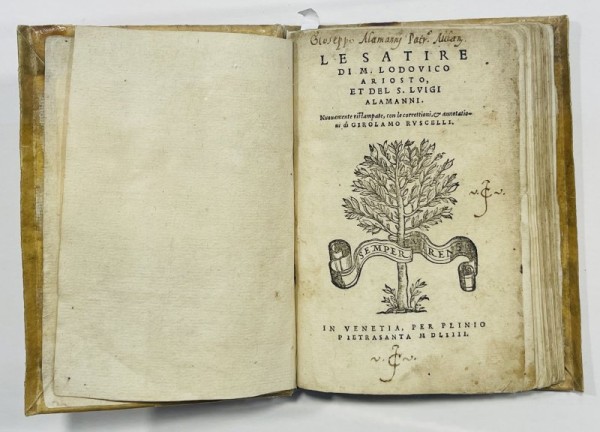 Legatura in piena pergamena da reimpiego con unghie e punti allumati al dorso; guardie sostitutite. 144 pagine numerate, compreso il frontepizio con titolo e ampia marca tipografica di Plinio Pietrasanta, antica firma di possesso di Giuseppo Alamanni; all'interno, numerosi capolettera abitati e silografati.  Quarta edizione, la prima nel 1543, delle Satire ariostee. Esemplare in buone condizioni salvo una lieve macchia di inchiostro al bordo laterale delle pagine 48 e 49