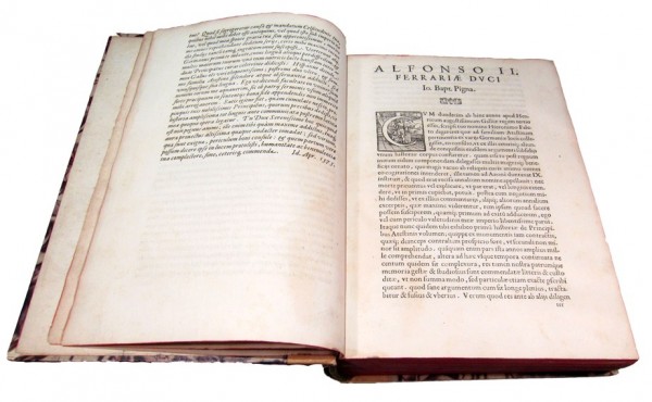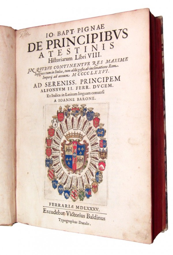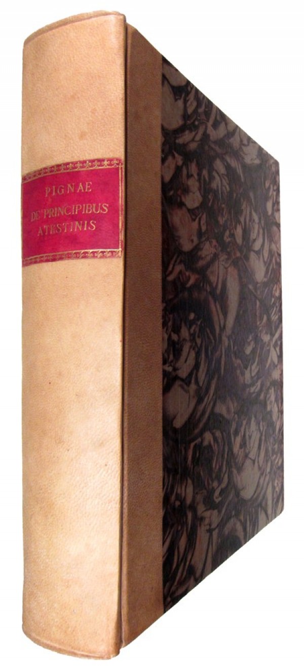 Legatura della prima metà del Novecento in mezza pergamena e carta marmorizzata; titolo in oro su tassello rosso al dorso, tagli rossi. Frontespizio con titolo e ricca figurazione araldica incisa, colorata da mano d'epoca all'acquerello e rialzata in oro, comprendente l'arma cinquecentesca degli Este circondata dagli stemmi attribuiti ai più illustri esponenti del casato; 6 pagine non numerate di dedicatoria, 660 pagine numerate; 8 pagine non numerate, di cui l'ultima bianca, per albero genealogico degli Estensi a partire dal preteso capostipite Caio Atio "Decurio, & Principe Atestis"(vissuto all'inizio del quinto secolo dopo Cristo) fino ai discendenti della metà del Cinquecento; 82 pagine non numerate per Catalogus e Index. Capilettera abitati e istoriati nonché fregi tipografici impressi a silografia. Il volume è la rara seconda edizione di una importante monografia dedicata ai signori di Ferrara, i quali si imposero come guerrieri e, soprattutto nel Rinascimento, come protettori della poesia e delle arti. La trattazione, dal tono apertamente celebrativo, spazia dalle favolose origini delle famiglia (collocate ai tempi della "rivolutione del Romano Imperio") fino al 1476. La prima edizione del libro fu impressa nella capitale estense nel 1570, in formato in-folio, per i tipi del Rossi e con testo in lingua italiana, ne seguì un'altra nel 1572, la terza, prima con testo in latino, è quella in esame. Esemplare in ottimo stato conservativo; interno fresco dalla carta particolarmente forte, lieve macchia alle pagine 106-107, qualche raro foglio con tracce di ossidazione.