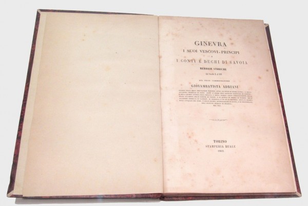 Legatura di metà '900 in mezza pelle e carta marmorizzata, titolo su tassello e fregi floreali in oro al dorso. 145 pagine numerate, compreso il frontespizio. Monografia storica sui vescovi di Ginevra e i duchi sabaudi nel corso di sei secoli, dal X al XVI. Bell'esemplare a pieni margini, lievi sporadiche fioriture alle prime carte.