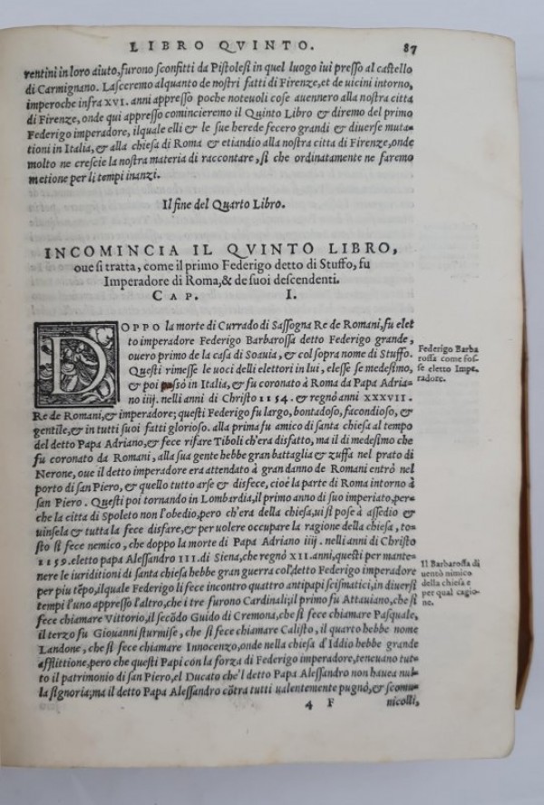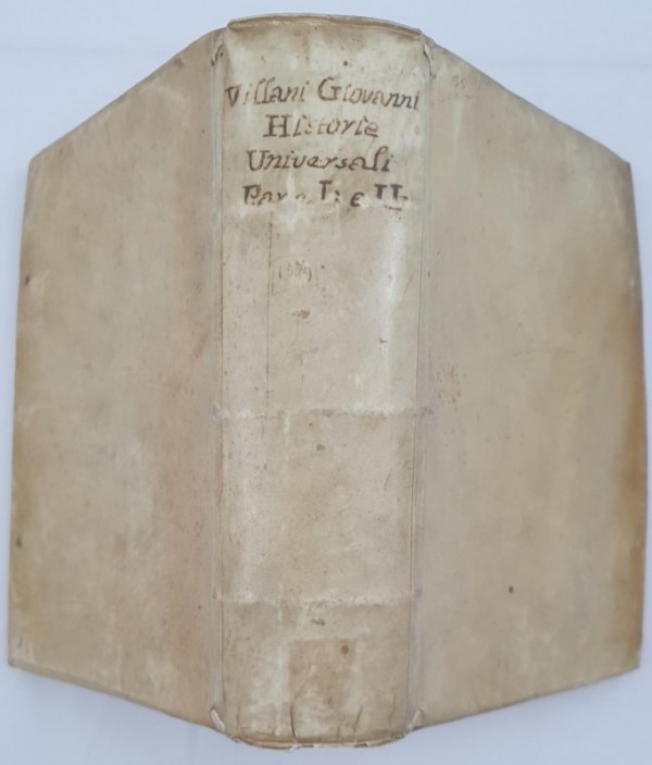 Legatura coeva in piena pergamena con unghie, autore e titolo manoscritto al dorso; tracce di bindelle deperdite. Due parti in un vol. La Prima Parte e la Seconda. Parte 1: (36)- 588, (12) pagine numerate. Al frontespizio, note manoscritte e timbro nobiliare. Parte 2: (12)- 232- (8) pagine numerate. Dedica "All'illustrissimo et eccellentissimo signore il signor Cosimo de Medici, duca di Firenze, et di Siena." Rara edizione del XVI secolo. Giovanni Villani è stato un mercante, storico ed editorialista, operò come commerciante e banchiere, socio prima dei Peruzzi, poi dei Buonaccorsi. Ricoprì tre volte la carica di priore, fu ufficiale incaricato di far fronte alla carestia che colpì Firenze nel 1329. Venne coinvolto nella bancarotta della famiglia Buonaccorsi e imprigionato per un breve periodo. Morì di peste mentre stava lavorando alla sua cronaca. Esemplare in buono stato conservativo; alone alla parte inferiore delle ultime pagine della Prima Parte e alle prime pagine della Seconda Parte.