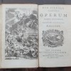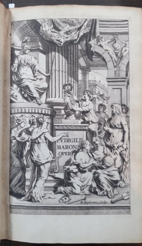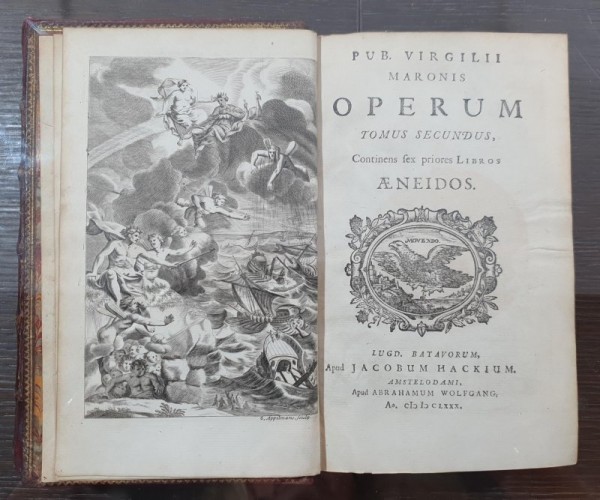 Elegante legatura coeva in pieno marocchino rosso con duplice filetto, cornice centrale con angolari fitomorfi impressi in oro ai piatti; cinque nervi rilevati al dorso con decori alle campiture e titolo in oro; tagli dorati; dentelle interne in oro e sguardie marmorizzate. AL contropiatto anteriore del I volume, ex-libris di I. Wight S.M. .(384 pagine non numerate: Dedicatio; Praefatio; P. Virgilii Maronis Vita; Index Erythraei) -704 + (2)-1124 + 982, pagine numerate; numerosi capolettera e finalini a silografia; tre frontespizi con vignette silografiche, antiporta incisa su rame e 15 belle tavole a piena pagina, sempre incise in rame da Appelmans. Al verso del primo frontespizio, grande ex-libris incollato di James Carrington Clerk. Pregevole edizione delle opere virgiliane, citata da molte bilbiografie come una delle migliori del XVII secolo. Esemplare complessivamente in buone condizioni conservative; piccoli restauri integrativi al piede e al bordo superiore dei dorsi; interno fresco e dalle tavole bene incise.