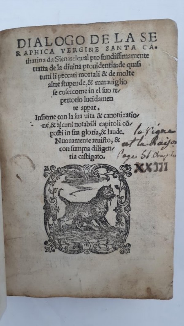 Legtaura coeva in pergamena floscia con unghie e con titolo manoscritto al dorso. 293 (i.e.251)-(1) carte numerate, compreso il frontespizio con titolo e ampia marca dei Sessa a silografia, altrta marca silografata al verso dell'ultima carta. . Altra edizione del Sessa dopo quella del 1540 di una delle più celebri opere di Santa Caterina da Siena, il Dialogo, pubblicato per la prima volta a Napoli nel 1478, e poi più volte ristampato nel corso del XVI secolo. Tuttavia tutte le edizioni cinquecentesche sono alquanto rare. Cfr. Edizioni Studio Domenicano, collana I Talenti: "Il Dialogo è uno dei capolavori di Caterina da Siena, in cui rivive in tutta la sua immensa forza l’ardore della sua contemplazione e della sua carità. Lei lo detta tra la fine del 1377 e l’ottobre del 1378, in circostanze drammatiche della vita politica ed ecclesiale: Caterina ne è coinvolta ben più di quanto potesse normalmente accadere a una donna del Trecento. Ma nel suo Dialogo si solleva al di sopra di sé e delle contingenze del tempo e sintonizza i propri desideri su quelli di Dio stesso. Gli interrogativi che la realtà quotidiana suscita in lei e intorno a lei, Caterina li pone a Dio stesso, e il suo Dialogo è soprattutto un ascolto attento e una registrazione desiderosa di non perdere nulla di quanto Dio le dava di intendere. È una “scrittura mistica” che non prescinde mai, anche nel linguaggio, dal contesto umano: Caterina «con la mente parlava con il Signore, e con la lingua del corpo parlava con gli uomini», come scrive il suo confessore e biografo Raimondo da Capua.