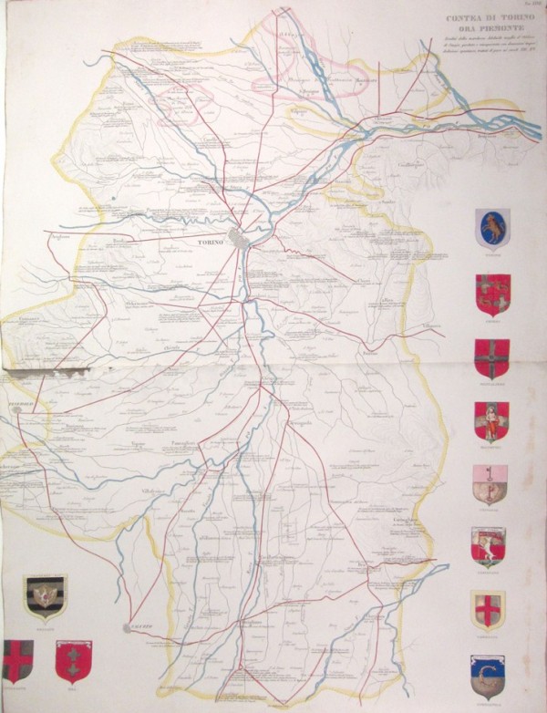 Incisione originale eseguita su matrice di rame, in bella coloritura all'acquerello d'epoca lungo i confini, con numerosi stemmi dalla coloritura particolarmente curata, rialzati in argento e oro. Carta senza testo al verso raffigurante il territorio della provincia di Torino al tempo. Tavola tratta dalla più monumentale opera a carattere araldico pubblicata nell'Ottocento. Le "Famiglie celebri italiane" uscirono in fascicoli tra il 1819 e il 1900, quindi molto dopo la morte del Litta che avvenne nel 1852 . La parte dedicata ai Savoia composta tra il 1839 e il 1845 è sicuramente la più pregiata in quanto straordinariamente ricca di tavole, di grande qualità per la loro coloritura. In gran parte sono superbamente colorate all'acquerello d'epoca e ritoccate "A la gomme"; tra queste ricordiamo i ritratti dei nobili sabaudi ad opera di artisti fiorentini seguiti personalmente dal Litta stesso: spiccano per suggestività quelli di Tommaso ed Eugenio, principi di Savoia e quello di Carlo Alberto a cavallo; particolarmente interessanti sono le illustrazioni dedicate ai collari degli ordini di San Maurizio e Lazzaro e della SS. Annunziata. Le tavole in bianco e nero illustrano ritratti, monumenti, edifici architettonici, monete e sigilli. Vi è inoltre una serie di 9 tavole incise all'acquatinta e impresse in seppia raffiguranti vedute dei luoghi più suggestivi presenti nei territori sabaudi. La parte probabilmente più significativa, tuttavia, è costituita dalle 29 carte geografiche raffiguranti i territori dei ducati sabaudi, notevolmente impreziosite dalla presenza dei rispettivi stemmi, magnificamente colorati e rialzati in argento ed oro; le prime due carte forniscono una visione globale degli stati sabaudi; le successive, invece, tratteggiano i confini di ciascun ducato o contea, delineandoli con differenti colori. Nel 1814, il Litta si impegnò, dunque, nell'ambizioso progetto: da allora fino alla morte la sua principale e quasi esclusiva attività fu la raccolta di informazioni, la stesura e la pubblicazioni delle Famiglie celebri italiane; e se pure non visse recluso, ma ebbe importanti contatti con il mondo culturale e anche politico milanese, la sua opera, i suoi interessi, le sue letture furono indirizzati e rivolti verso quest'unico grande obiettivo. Egli concepì le Famiglie celebri come un'opera a dispense, ciascuna delle quali dedicata a una famiglia, anche se non fu raro il caso di famiglie la cui storia richiese più dispense (come per gli Orsini, i Medici, i Savoia, i Gonzaga) o di casate minori accorpate in una sola dispensa. Alla sua morte, egli aveva pubblicato 135 fascicoli, per 113 famiglie: l'opera fu proseguita dai suoi più stretti collaboratori (in particolare F. Oderici, L. Passerini, F. Stefani) che portarono a 150 le famiglie trattate in 184 fascicoli, l'ultimo dei quali fu pubblicato nel 1883, cui seguì un altro fascicolo nel 1900. Esemplare in eccellenti condizioni, corta di margini.