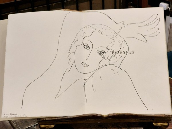 Original edition with fascicles and loose leaves in editorial paperback, half calf dust jacket with author and title impressed in black on the spine and sleeve in morocco-effect paper, canvas cardboard box with burgundy calf gusset on the spine bearing author and title. 153 numbered pages, 29 original etchings printed in black, 23 of which are full-page on Arches paper. Numbered copy (90 /145) signed in pencil by Henri Matisse, enriched by an original black ink drawing by the artist, executed on the double sheet dedicated to the half title and, at the bottom left of the sheet, an autographed dedication “à Max Pellequer. 13/342 Henri Matisse” (the author’s original drawing is found in the first 5 copies of the present edition only). This is one of 90 copies on Arches paper, from a total edition of 145 including 20 “Hors-Commerce” works. Copy in perfect condition.