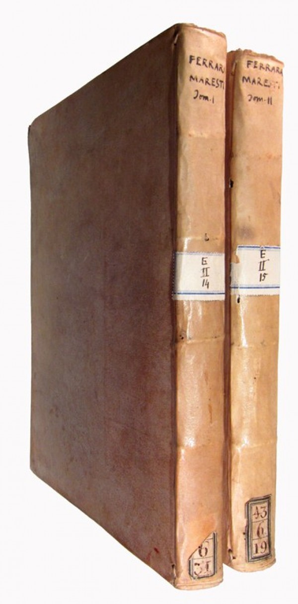 Bella legatura originale in piena pergamena, dorso a 4 nervi rilevati con autore e numero di tomo manoscritti alla parte superiore ed etichette con numeri di posizione alla parte centrale inferiore. Vol. I: (4) 264 pagine numerate, frontespizio con titolo in rosso e nero e stemma silografico della famiglia del cardinale Sigismondi Chigi. Nel testo 11 incisioni silografiche a piena pagina raffiguranti la città di Ferrara. Testo elegantemente inquadrato in cornice di duplice filetto, numerose testatine e capolettera decorati a silografia; Vol. II: (18) 226 (6) pagine numerate, frontespizio con titolo in rosso e nero e marca tipografica con, al verso, ampio stemmario a silografia. Nel testo 3 incisioni silografiche a piena pagina raffiguranti la città di Ferrara. In entrambe i volumi, in testa ad ogni sezione dedicata alla storia delle diverse famiglie nobili ferraresi, incisioni silografiche nel testo, raffiguranti i relativi stemmi nobiliari. Rara opera dedicata alla storia e all'evoluzione genealogica delle più note famiglie nobili ferraresi. Il primo volume tratta delle famiglie il cui nome comincia per A e B, il secondo di quelle il cui nome comincia per C. Si sa dell'esistenza di un terzo tomo, opera postuma redatta dal conte Gio. Francesco Maresti, figlio di Alfonso pubblicata nel 1708. Ad impreziosire l'opera 14 incisioni a silografia, ciascuna delle quali rappresentante una veduta della città di Ferrara. L'esemplare si presenta in ottimo stato di conservazione, segnalata mancanza del terzo tomo e dei ritratti dedicatari.
