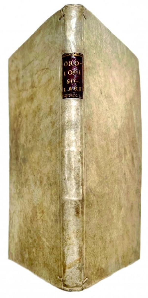 Legatura coeva in piena pergamena rigida; titolo in oro su tassello rosso al dorso; tagli spruzzati di rosso. 47-(17) pagine numerate, compreso il frontespizio. 1 tavola incisa e ripiegata all'ingresso del volume come antiporta; al fondo del volume, 5 tavole fuori testo incise e ripiegate. Prima edizione, in variante B. con 17 pagine non numerate finali in luogo di 21. Opera di carattere essenzialmente pratico sulla costruzione degli orologi solari, con l’aggiunta delle tavole gnomoniche per le ore francesi, per le ore italiane delle rifrazioni, delle altezze per le principali località venete. Esemplare in ottime condizioni conservative.