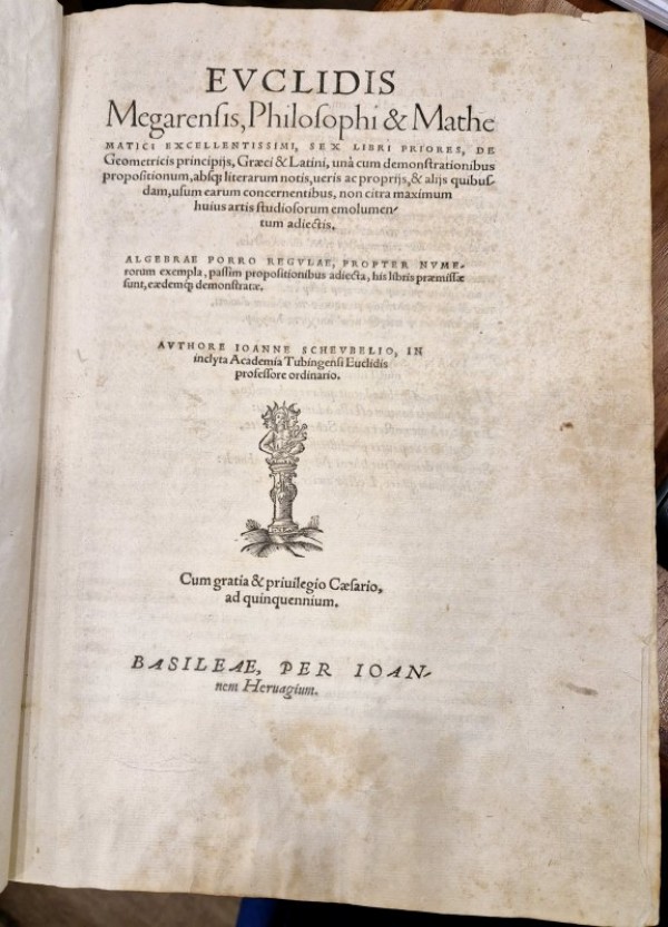 Legatura di epoca settecentesca in piena pergamena rigida; al dorso, autori in oro su tassello color mattone, eleganti fregi floreali agli scomparti; tagli spruzzati di rosso; sguardie marmorizzate. (8)-315-(1) pagine numerate, compreso il frontespizio con titolo e marca tipografica, ripetuta all'ultima pagina. All'interno, numerosi capolettera abitati e diagrammi silografici. Rara edizione con il commento di Johann Scheubel, matematico tedesco. Nel 1549 Joachim Camerarius pubblica le enunciazioni di Euclide dei primi sei libri in greco e latino (Lipsia). Il libro, con prefazione, sembra essere stato compilato da Rhaeticus (1514-1576), allievo prediletto di Copernico. Un'altra edizione con le prove delle proposizioni dei primi tre Libri fu pubblicata da Moritz Steinmetz nel 1577 (Lipsia); una nota del tipografo attribuisce la prefazione allo stesso Camerarius. Nel 1550, l'edizione in esame: Iohann Scheubel pubblicò a Basilea per Ioan. Hervagium i primi sei Libri in greco e latino “insieme a prove vere e proprie delle proposizioni, senza l'uso di lettere” (cioè lettere che indicano punti nelle figure), le varie linee rette e gli angoli descritti a parole. Esemplare in discrete condizioni, consuete quanto lievi arrossature e fioriture alle pagine.