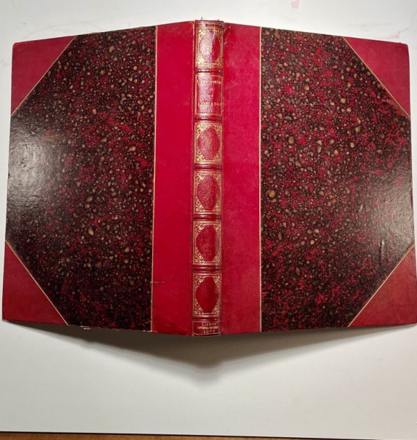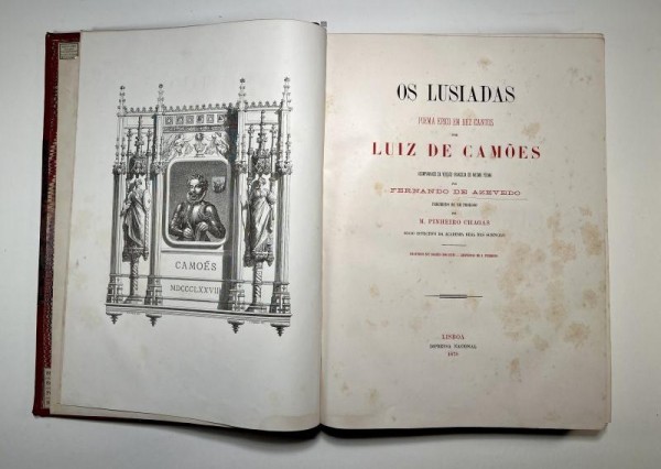 Legatura coeva in mezza pelle rossa, piatti marmorizzati con angolari in pelle rossa profilati in oro; dorso decorato a 5 nervi con autore e titolo al secondo scomparto e fregi in oro agli altri, luogo, anno ed editore all'ultimo tassello, il tutto impresso in oro; sguardie marmorizzate, ex libris al contropiatto di "Annibal Fernandez Thomaz".Pagine 337. Antiporta incisa con ritratto dell'autore entro edicola architettonica con figure, frontespizio scritto in rosso e nero, diverse tavole incise a sinografia di testa a piena pagina fuori testo. Testo scritto in portoghese e in francese. L'opera stampata in prima edizione nel 1872, è considerata il poema epico del popolo protoghese, ispirata ai classici letterari Greco-Latini, descrive in modo leggendario e fantastico i viaggi di scoperta portoghesi del XV e XVI secolo; una parte importante è dedicata al viaggio guidato da Vasco de Gama dal Portogallo all'India. Il testo è suddiviso in 10 canti scritti in ottave endecasillabiche. Esemplare in buone condizioni salvo sporadiche lievi fioriture.