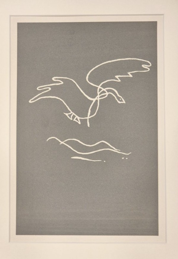 Incisione originale a linoleum impressa su fondo grigio e su carta filigranata BFK RIVES. Di questa stampa ne furono fatte diverse tirature, la più conosciuta fu in 30 copie su Japan firmate e numerate e impresse su fondo nero, inoltre alcune tirature di prova, come quella in esame, furono fatte su carte differenti e con il fondo di differente colore, non vennero ne firmate ne numerate. Esemplare in perfette condizioni.