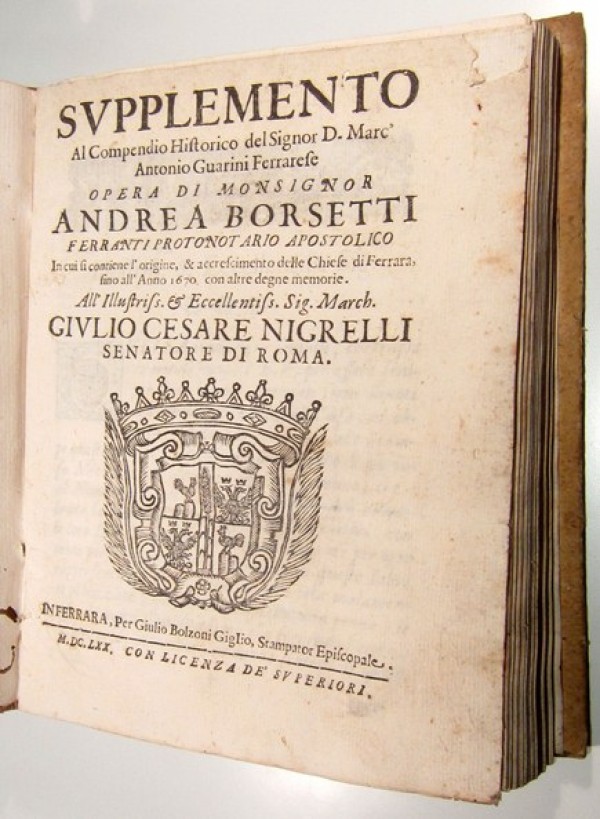 Legatura in cartonnage color ocra con titolo manoscritto al dorso. 8 pagine non numerate compreso il frontespizio con titolo e marca tipografica silografata con stemma araldico; 284 pagine numerate di testo; alla pagina 242 grande stemma cardinalizio silografato con motto sottostante Hac Stella Duce. Numerosi fregi silografati. I edizione di questa interessante monografia sulla storia delle chiese di Ferrara e altre notizie sulla città. Bell'esemplare, dai caratteri nitidi impressi su carta forte. Cfr. LOZZI C., "Biblioteca istorica della antica e nuova Italia [...]", Imola 1886-1887, n. 1631