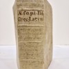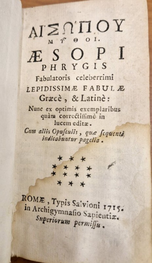 Legatura coeva in piena pergamena da riutilizzo di antico codice come da traparenza, dorso con autore e titolo manoscritto abbreviato, tagli spruzzati. 600 pagine numerate, testo in greco con traduzione a fronte in latino. Primo capolettera silografato. Le famose favole dello scrittore greco antico Esopo precedute dalla narrazione della sua vita. Esemplare in discrete condizioni con alcune lievi gore d'acqua, più evidenti all'angolo inferiore delle prime 20 pagine, altrimenti fresco e bene impresso.