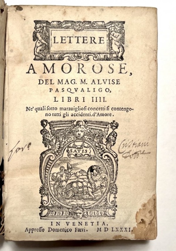 Legatura coeva in piena pergamena floscia con unghie, punti allumati al dorso. (16)-671-(1b) pagine numerate. Frontespizio con edicola silografata alla parte superiore a contenere parte del titolo e ampia marca tipografica silografata alla parte inferiore, nota manoscritta di possesso; testatine e capilettere silografati, all'inizio di ogni libro, mancanti nel secondo. L'opera è quasi un romanzo epistolare dove l'autore tratta temi amorosi. Prima edizione dei primi due libri del 1563, mentre la prima edizione dei 4 libri risale al 1573. Esemplare in discrete condizioni, tracce di sciupatura alla legatura col dorso leggermente scollato, piccola macchiolina al margine inferiore destro del frontespizio, alcune frasi cassate al fondo di pag. 139 e all'inizio di pag. 140, numerose piccole chiose laterali, lieve gora al margine inferiore delle ultime 70/80 pagine, antichi appunti manoscritti in calce all'ultima pagina.