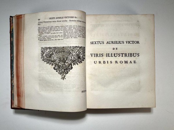 Legatura in piena pelle maculata, dorso a 5 nervi rilevati con decori floreali in oro agli scomparti e titolo in oro su tassello rosso. Sguardie marmorizzate, tagli rossi. (48)- 668- (134) pagine numerate. Frontespizio con marca tipografica e titolo in rosso e nero, antiporta incisa fuori testo. Capilettera, finalini e testatine silografati, una bella tavola incisa a tutta pagina all'interno del testo con medaglie e monete romane; altre monete incise lungo il testo con le effigi dei personaggi più importanti della storia romana. Questa edizione riunisce le diverse opere dello storico e politico romano Aurelio Vittore (c. 320 - c. 390). I commenti sono dei più illustri filologi e storici guidati dall'editore Jan Arntzenius (1702-1759), Johannes Metellus (1520-1597), Andreas Shottus (1579), Fredericus Sylburgius (1536-1596) e Anna Fabri (1645-1727). ) Esemplare in complessive buone condizioni con lieve ossidazione a molte carte alcune più marcate.