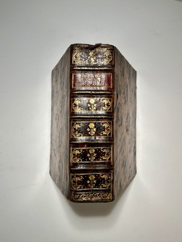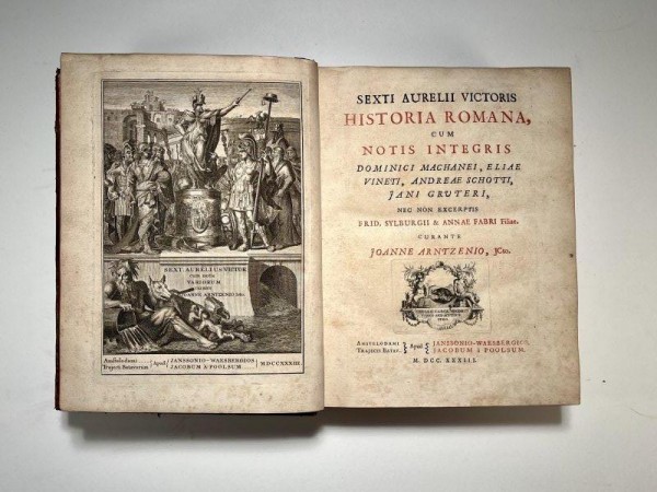 Legatura in piena pelle maculata, dorso a 5 nervi rilevati con decori floreali in oro agli scomparti e titolo in oro su tassello rosso. Sguardie marmorizzate, tagli rossi. (48)- 668- (134) pagine numerate. Frontespizio con marca tipografica e titolo in rosso e nero, antiporta incisa fuori testo. Capilettera, finalini e testatine silografati, una bella tavola incisa a tutta pagina all'interno del testo con medaglie e monete romane; altre monete incise lungo il testo con le effigi dei personaggi più importanti della storia romana. Questa edizione riunisce le diverse opere dello storico e politico romano Aurelio Vittore (c. 320 - c. 390). I commenti sono dei più illustri filologi e storici guidati dall'editore Jan Arntzenius (1702-1759), Johannes Metellus (1520-1597), Andreas Shottus (1579), Fredericus Sylburgius (1536-1596) e Anna Fabri (1645-1727). ) Esemplare in complessive buone condizioni con lieve ossidazione a molte carte alcune più marcate.