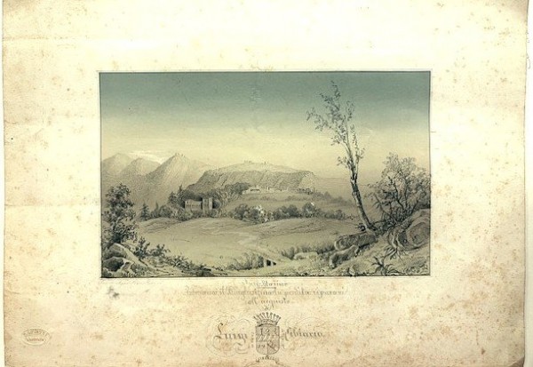 Disegno originale a matita su fondo in leggerissima acquerellatura nei colori verde, ocra e azzurro, con due rialzi a biacca. Al disotto della parte figurata, minutissima firma dell'artista a sinistra, non identificata; al centro, il titolo e, sottostante, il nome e lo stemma del conte Luigi Cibrario. Il titolo cita sia Bartolomeo Borghesi, numismatico ed epigrafista naturalizzato sanmarinese, sia il conte Luigi Cibrario a cui è dedicata l'opera, Cibrario nel 1860 ottenne il titolo onorifico di ministro di Stato. Anche la Repubblica di San Marino gli diede la cittadinanza e il titolo patrizio (1859), ed in veste di suo plenipotenziario il Cibrario ne concluse il trattato di commercio ed amicizia con l'Italia (15 apr. 1862). La pregevole veduta raffigura la rocca sanamrinese e il suo paesaggio circostante. Esemplare in buone condizioni, lievi fioriture.