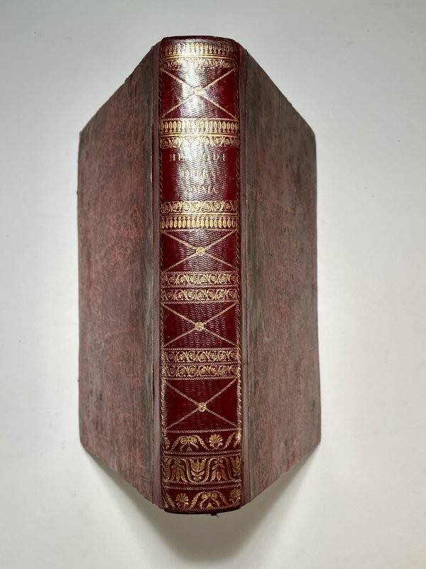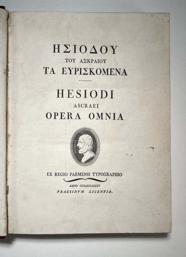 Legatura in elegante mezzo marocchino rosso, con elaborati fregi e titolo in oro al dorso piatti in carta marmorizzata di epoca successiva con al piatto anteriore dedica da premio per un liceo ticinese del 1831 impressa in oro; sguardie marmorizzate; tagli marmorizzati policromi. I parte  (2)-110; II parte (4)-16-XXXV-(1b)-248 pagine numerate.  Due parti in un volume, la prima in lingua greca la seconda in lingua latina con ritratto di Esiodo in rame su ciascun dei due frontespizi. La scrittura greca fa fronte al classico romano tondo nella parte in lingua latina che è a cura di Bernardo Zamagna. Elegante prima edizione bodoniana di quest'opera di Esiodo, il primo poeta di lingua greca di cui si ha traccia autobiografica. Esemplare in discreto stato conservativo, segnalata legatura da premio liceale, lievi tracce di sposrco al primo frontespizio e a qualche pagina, macchia alla parte interna del secondo frontespizio.