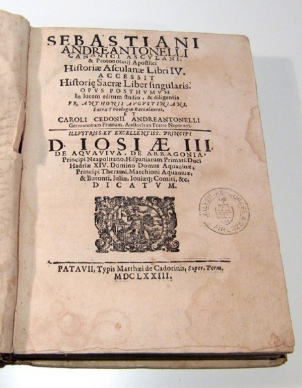 HISTORIAE ASCULANAE LIBRI IV. ACCESSIT HISTOIRE SACRAE LIBER SINGULARIS. OPUS POSTHUMUM. IN LUCEM EDITUM STUDIO, & DILIGENTIA FR. ANTHONII AUGUSTINIANI...ET CAROLI CEDONII ANDREANTONELLI.