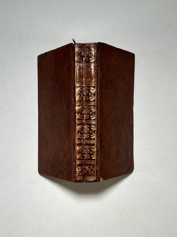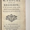 Legatura in piena pelle marrone maculata, dorso con fregi floreali in oro agli scomparti; titolo e autore su tassello; tagli rossi; sguardie marmorizzate. XXV-(9)-420-(2cb). Frontespizio con fregio tipografico silografata; testatine, finalini e alcuni capilettera silografati. Il testo in francese si apre con la Vita di M. Pascal scritto da madame Perier, sua sorella, seguono poi: i Discorsi sui pensieri; i Discorsi sulle bozze dei libri di Mosè; la Difesa dei pensieri di Pascal contro la critica di M. de Voltaire; Pensieri di M. Pascal sulla Religione e su altri argomenti. Esemplare in buono stato conservativo, lievi tracce di usura alle cerniere del dorso, altrimenti interno fresco e con buona marginatura.