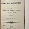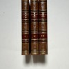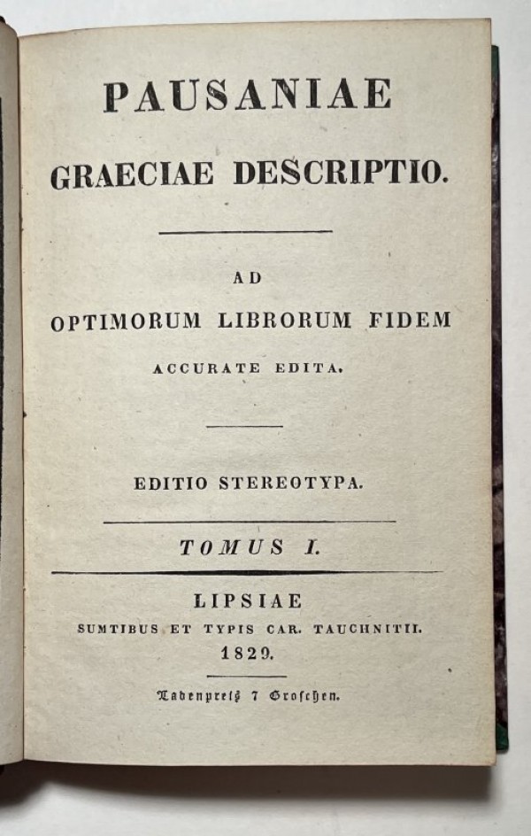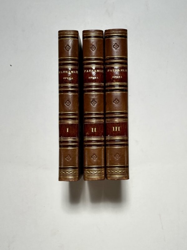 Legatura in mezza pelle avana, piatti marmorizzati, dorso a 5 nervi con decori in oro, autore e numero di tomo in oro su tassello marrone; ex libris di possesso al contropiatto con la scritta "Faire et Taire"; sguardie marmorizzate, tagli rossi . (1cb)-339-(1cb) pagine numerate; (1cb)-376-(1cb); (1cb)-372-(1cb). All'antiporta del primo volume, incisione silografica a piena pagina con ritratto dell'autore inscritto in un ovale con il nome in greco e cornice decorata con una lira e altri strumenti musicali. Testo in lingua greca. Pausania è stato un militare spartano, i suoi testi sono considerati la fonte più importante per la conoscenza della topografia e storia dell'arte greca. Esemplare in buono stato conservativo salvo alcune carte con lievi ossidazioni.