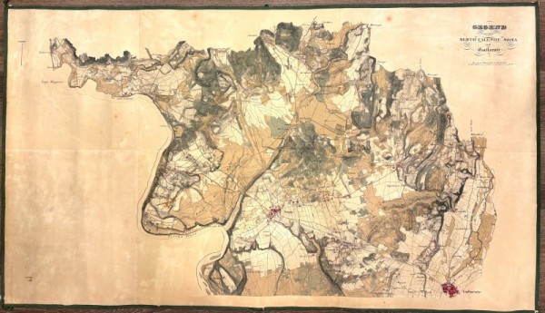 Grande carta topografica impressa in litografia su più fogli uniti e telata all'epoca bordata di seta verde e finemente colorata all'acquerello d'epoca. All'angolo superiore destro dati tipografci. La mappa raffigura minuziosamente il territorio compreso fra Gallarate e Sesto Calende, al di qua del Ticino con al centro Soma. Esemplare in ottimo stato di conservazione.