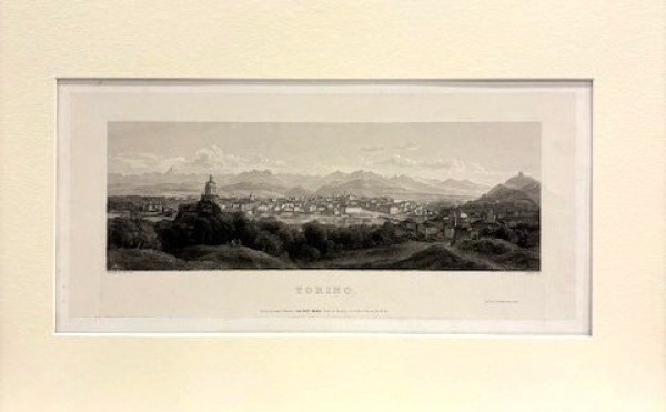 Incisione originale eseguita all'acquatinta su matrice di acciao e impressa su "papier de chine" applicata su cartoncino, secondo le edizioni più lussuose. La raffinata incisione rappresenta una veduta prospettica di Torino presa dalla collina al di sopra di Villa della Regina; la tavola è simile a quella incisa sempre da Salathè su disegno di Carlo Bossoli nel 1850, ma qui in formato assai più ridotto. Sotto la parte figurata, didascalie esplicative, titolo, indirizzi dell'editore Maggi e dello stampatore Chardon. La Le pregevole incisione provine da una serie di dodici vedute dedicate a Torino. Le immagini, incise dallo svizzero Salathé (dal 1823 attivo a Parigi) sono tratte da disegni del luganese Bossoli, celebre vedutista e pittore di battaglie. Le belle raffigurazioni sono dilatate scenograficamente dal punto di vista prospettico, e sono animate da numerose figurine umane in costumi dell'epoca. A. Peyrot ha proposto di datare le tavole al 1853, considerando la presenza "nella veduta di pazza Palazzo di Città del monumento al Conte Verde, posto nel 1853", e la citazione della raccolta nel catalogo Maggi dello stesso anno. Esemplare in ottimo stato conservativo.