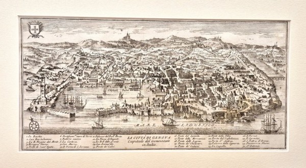Incisione originale eseguita all'acquaforte su matrice di rame, impressa su foglio bianco al verso. Sotto la linea d'inquadramento inferiore, titolo e legenda con 30 riferimenti. La tavola è tratta da una monumentale descrizione di tutte le nazioni del mondo impressa a Venezia, in 26 tomi, fra il 1737 e il 1766. Il testo dei volumi è una versione italiana di quello composto in inglese da Thomas Salmon. L'immagine in esame è una veduta prospettica di Genova con le sue fortificazioni. Interessante è la descrizione dei dintorni della città, punteggiati da particolari paesaggistici. Esemplare in buono stato conservativo; tracce di piegatura presenti in tutte le prove.
