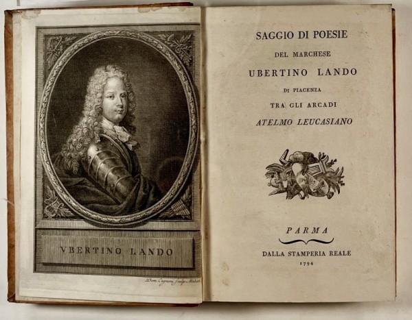 -SAGGIO DI POESIE DEL MARCHESE UBERTINO LANDO DI PIACENZA TRA GLI ARCADI ATELMO LEUCASIANO. Unito a: VERSI SCIOLTI DEL SIGNOR AGOSTINO PARADISI NOBILE REGGIANO. Unito a: RIME DI IACOPO VITTORELLI NUOVA EDIZIONE.