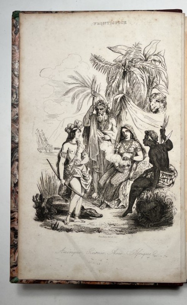 Legatura in mezzo marocchino rosso e carta policroma marmorizzata con bordura a filetto longitudinale dorati; dorso con tiitolo e ampio fregio in oro, sguardie marmorizzate. Occhietto, antiporta inciso a piena pagina raffigurante scena con 4 figure rappresentanti ognuna un continente con una scritta sottostante "Amerique ,Oceanie, Asie, Afrique; frontespizio con una vignetta silografata raffigurante una vela. (2)- 657-(3) pagine numerate. Testo in francese suddiviso in due colonne e 15 tavole incise fuori testo (compreso il frontespizio) lungo tutto il volume. Il volume fa un riassunto della scoperta, della conquista e dell'origine degli antichi popoli dell'America settentrionale e meridonale; della loro morale, dei loro costumi, delle loro pratiche e delle loro religioni. Inoltre, descrive le arti, le scienze, il commercio, le manifatture e i vari governi nel loro stato attuale; produzioni naturali, curiosità ecc. Alcuni brani sono tratti o tradotti dai più celebri racconti di viaggiatori francesi e stranieri, e organizzati nel testo dalla Società di geografi e letterati. Esemplare in buone condizioni,salvo lievi arrossature.