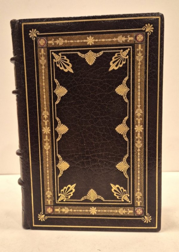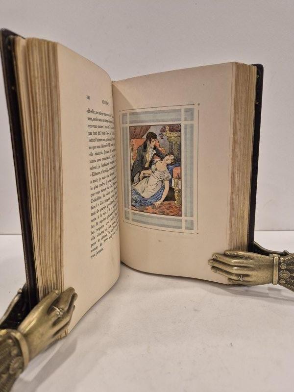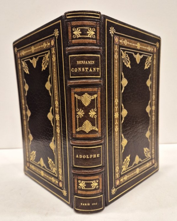 Bella legatura coeva, firmata da Zendel e ad imitazione delle legature stile impero, in pieno marocchino marrone con plurimi filetti, semplici, con pal,ette angolai e, quelli più interni con pamette e fregi; all'interno della seocnda serie di filetti, insetrto in marocchino color tabacco con fregi in oro florerwali e a catenella, angolari in oro su pelle rossa; dorso a 4 nervi rilevati con titolo, filetti e decori ornamentali impressi in oro, in rosso e inserti in pelle avana. Ampie dentelle in oro con angolari in oror su inserto verde; tagli dorati e sguardie in seta marrone. Controsguardie policrome, mantenuta la brossura color crema con titolo in nero e in blu e vignetta a colori. Frontespizio egualmente in nero e in blu con altra vignetta a colori. Numerose illustrazioni a colori n.t. e f.t. di Serge de Solomko; 23 tavole, costituenti il secondo stato delle illustrazioni f.t., sono collocate in una suite in fine "avec remarques", di seguito al colophon. Superba edizione figurata dal De Solomko del capolavoro letterario di Constant, nell'ambito della "Petite Bibliotéque Andréa". Tiratura complessiva di 1012 esemplari; il nostro non numerato, è della tiratura di 99 (dal n° 81 al 180), su Carta Imperiale del Giappone, "ou vélin teinté d'Arches"; esemplare ad personam riservato a Georges Vicaire, con omaggio autografo di uno degli editori, F. Ferroud, in calce alla giustificazione di tiratura. George Vicaire (1853-1921) fu bibliotecario della Bibliotéque Nationale e corrispondente della Biblioteca Vaticana. Fu autore di fondamentali bibliografie sulla gastronomia, su Honoré de Balazac, sulla letteratura del XIX secolo. Finito di stampare il 15 maggio 1913. L'"Adolphe" pubblicato in prima edizione nel 1816, costituisce uno dei più ragguardevoli esempi di analisi psicologica in ambito romanzesco del XIX secolo; l'eroe del libro fu anche visto come caratteristico prototipo, accanto a "René" di Chateaubriand e "Obermann" di Sénancour, del cosidetto "male del secolo". Esemplare in ottimo stato di conservazione.