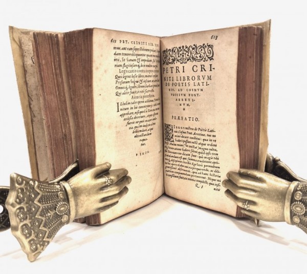 Legatura antica  da reimpiego  in piena pergamena rigida con unghie, nome dell'autore manoscritto al taglio inferiore, tagli rossi. 864-(4) pagine numerate, errore di numerazione a pagina 13 (14). Marca tipografica silografata di Griphium al frontespizio con firma manoscritta di appartenenza di "Luigi Morozzo", conte della Briga; testatine, finalini e capilettera silografati. Pietro Crinito, al secolo, Pietro Baldi del Riccio, è stato un umanista e poeta fiorentino, le sue opere sono note per aver influenzato il pensiero e l'opera di Nostradamus. Questa edizione contiene tutte e tre le opere conosciute di Pietro Baldi: De Honesta Disciplina, pubblicata la prima volta nel 1504, è una raccolta di poesie, traduzioni, epigrammi e citazioni dirette di altri scrittori come Tullio Laureato, Ausonio, Diogene Laerzio, Plutarco e altri; le altre due opere sono entrambe antologie di poesie latine. Esemplare in discrete condizioni, alcune pagine leggermente fiorite, qualche macchiolina, lievi e contenute gore alle pagine iniziali e finali.