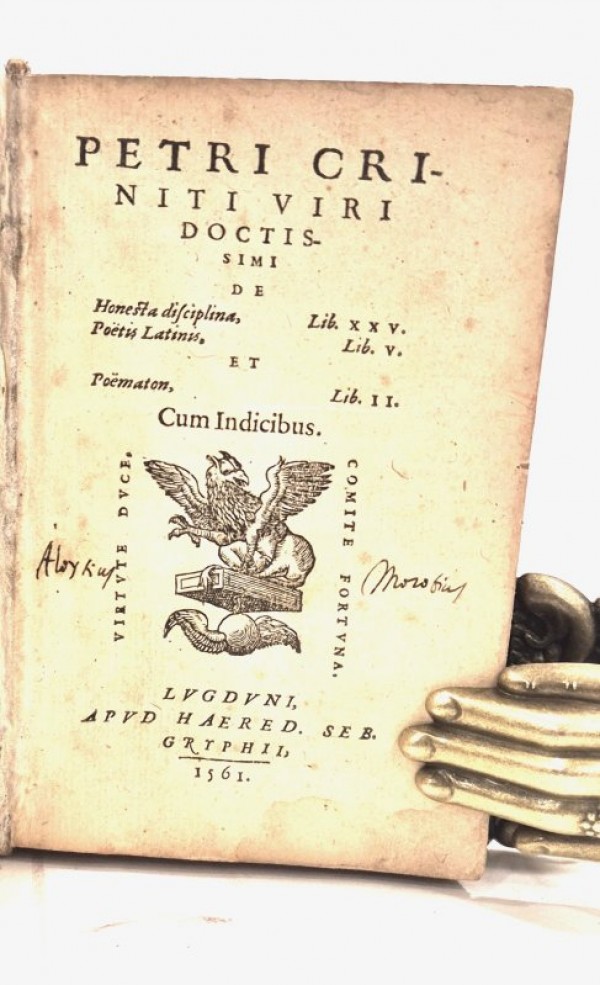 Legatura antica da reimpiego in piena pergamena rigida con unghie, nome dell'autore manoscritto al taglio inferiore, tagli rossi. 864-(4) pagine numerate, errore di numerazione a pagina 13 (14). Marca tipografica silografata di Griphium al frontespizio con firma manoscritta di appartenenza di "Luigi Morozzo", conte della Briga; testatine, finalini e capilettera silografati. Pietro Crinito, al secolo, Pietro Baldi del Riccio, è stato un umanista e poeta fiorentino, le sue opere sono note per aver influenzato il pensiero e l'opera di Nostradamus. Questa edizione contiene tutte e tre le opere conosciute di Pietro Baldi: De Honesta Disciplina, pubblicata la prima volta nel 1504, è una raccolta di poesie, traduzioni, epigrammi e citazioni dirette di altri scrittori come Tullio Laureato, Ausonio, Diogene Laerzio, Plutarco e altri; le altre due opere sono entrambe antologie di poesie latine. Esemplare in discrete condizioni, alcune pagine leggermente fiorite, qualche macchiolina, lievi e contenute gore alle pagine iniziali e finali.