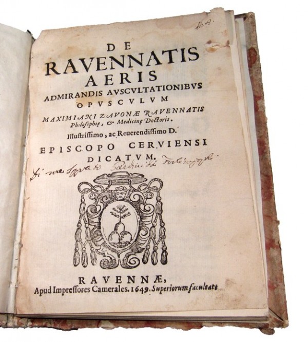 Legatura settecentesca in carta decorata colore rosa con segni di usura e abrasioni in particolare al dorso, fogli di guardia ai contropiatti di epoca ottocentesca, male incollati. 8 pagine numerate, compreso il frontespizio con titolo e stemma vescovile silografato, nota di possesso manoscritta da antica mano; 108 pagine numerate. Raro e interessantissimo libretto in cui l'autore, celebre medico e filosofo ravennate, narra della salubrità della vita a Ravenna, elenca le caratteristiche della città con riferimento alla qualità dell'aria, dei prodotti agricoli e viticoli, interessanti gli accenni alla qualità del vino. L'opera venne citata dal Fabbri. L'autore scrisse, inoltre, un celebre trattato sul tabacco e sui danni che causava. Esemplare in discrete condizioni, alcune lievi uniformi ossidazioni poche carte, modeste gore marginali alla parte superiore di quasi tutto il volume.