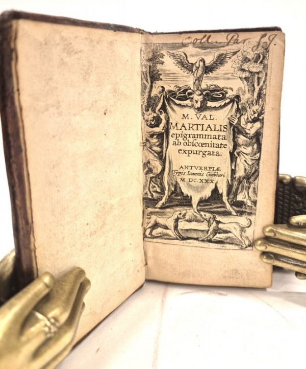 Legatura coeva  in piena pelle avana, bordura floreale ai piatti con all'interno campitura di gigli in oro, dorso con 4 nervi rilevati, piccoli gigli in oro agli scomparti,  titolo e autore abbreviato su tassello rosso; tagli in oro. 256 pagine numerate (qualche errore di numerazione). Frontespizio figurato  inciso con elementi simbolici raffigurante due satiri che tengono una pelle di animale, due cani al fondo e grande uccello sovrastante.  La prima edizione risale al 1501. Marziale, poeta romano del I secolo proveniente dalla Spagna, deve la sua fama proprio ai suoi epigrammi. Epigrammata è un'opera giovanile di letteratura romana, esprime i dettagli della vita a Roma, concentrandosi sugli aspetti più biechi del quotidiano durante l'Impero. Marziale descrive le condizioni di vita di Roma fra medici e senatori corrotti, il trattamento crudele degli schiavi e i segreti e le dicerie sulla vita degli imperatori. A causa dello stile di scrittura di Marziale questo è spesso considerato il primo testo satirico, poiché usava l'umorismo per mascherare il suo disprezzo per la vita con cui aveva così tanta familiarità. Epigrammata è suddiviso in 14 libri contenenti più di 1500 brevi composizioni.  Esemplare in buone condizioni, salvo uniformi arrossature (da pag 193 ca).