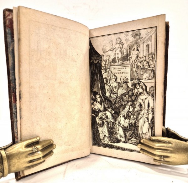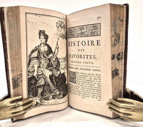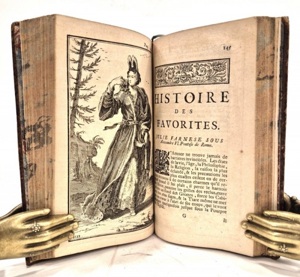 Legatura coeva in piena pelle marrone "spruzzata" con filetto a secco ai piatti; dorso con 5 nervi rilevati, fregi in oro agli scomparti, titolo e numero di tomo in oro su tassello rosso; sguardie marmorizzate; tagli marmorizzati con alcune maculazioni di inchiostro nero di epoca successiva. I volume (3cb) un'antiporta figurata incisa a piena pagina fuori testo-(6)-268 pagine numerate. II volume (1cb)- frontespizio e poi continua la numerazione dal primo volume da 269 a 603- (1)-(1 cb) pagine numerate. Capilettera, testatine e finalini silografati; 10 tavole incise fuori testo di eleganti ritratti a figura intera di donne. Seconda edizione, la prima nel 1700, di questa opera di Anne De La Roche-Guilhen, scrittrice e traduttrice francese. Compose opere per la corte e per il Re Carlo II e fu traduttrice dallo spagnolo di diverse opere. Protestante, si trasferì in Inghilterra, qui scrisse i suoi testi che venivano stampati in Olanda per poi essere distribuiti clandestinamente in Francia. Esemplare in buone condizioni, tracce di ossidazione ad alcune carte, tavole bene incise.