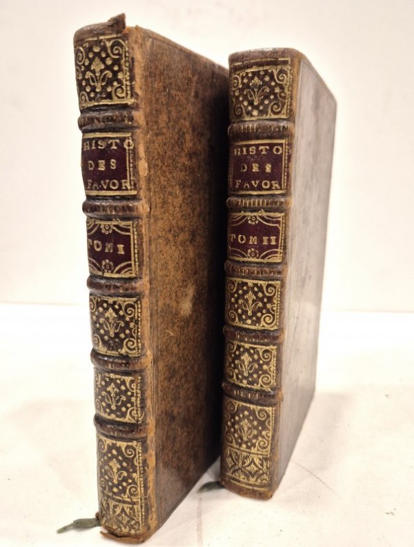 Legatura coeva in piena pelle marrone "spruzzata" con filetto a secco ai piatti; dorso con 5 nervi rilevati, fregi in oro agli scomparti, titolo e numero di tomo in oro su tassello rosso; sguardie marmorizzate; tagli marmorizzati con alcune maculazioni di inchiostro nero di epoca successiva. I volume (3cb) un'antiporta figurata incisa a piena pagina fuori testo-(6)-268 pagine numerate. II volume (1cb)- frontespizio e poi continua la numerazione dal primo volume da 269 a 603- (1)-(1 cb) pagine numerate. Capilettera, testatine e finalini silografati; 10 tavole incise fuori testo di eleganti ritratti a figura intera di donne. Seconda edizione, la prima nel 1700, di questa opera di Anne De La Roche-Guilhen, scrittrice e traduttrice francese. Compose opere per la corte e per il Re Carlo II e fu traduttrice dallo spagnolo di diverse opere. Protestante, si trasferì in Inghilterra, qui scrisse i suoi testi che venivano stampati in Olanda per poi essere distribuiti clandestinamente in Francia. Esemplare in buone condizioni, tracce di ossidazione ad alcune carte, tavole bene incise.