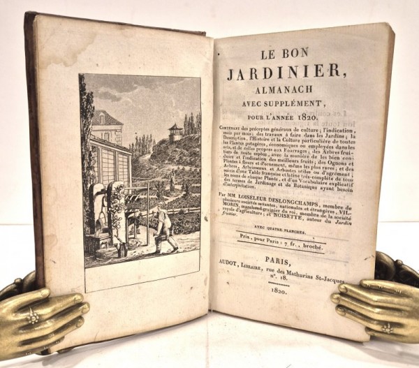 Legatura coeva in piena pelle marrone, dorso con ricche decorazioni in oro agli scomparti e titolo in oro su tassello tinto in epoca successiva di nero; sguardie marmorizzate; tagli spruzzati di rosso. XXX - 940 - (2) - 16 - (Supplèment de l'Almanach) - 12 (Ouvrages nouveaux) pagine numerate. Occhietto, antiporta inciso figurato, frontespizio contenente una breve sintesi dei contenuti dell'almanacco; testatina figurata all'inizio del primo capitolo. 3 tavole incise fuori testo. Almanacco curato da tre dei più importanti botanici e agronomi del XVIII -XIX sec. per istruire i giardinieri riguardo la coltivazione delle piante da giardino e dei fiori, in particolare le rose. L'almanacco ebbe una pubblicazione annuale a partire dal 1755. All'interno le tavole illustrative incise sui metodi di coltivazione (p.336 e p. 337) e sulle parti di una pianta da fiore (p.831). Una tavola in ordine alfabetico e un supplemento dedicato all'anno di pubblicazione 1820 completano l'opera. Esemplare in ottime condizioni, leggera gora d'acqua all'angolo superiore esterno dell'antiporta, piccoli fori di tarlo da pag 854 a pag. 16 del supplemento, interessano alcune letterine di testo.