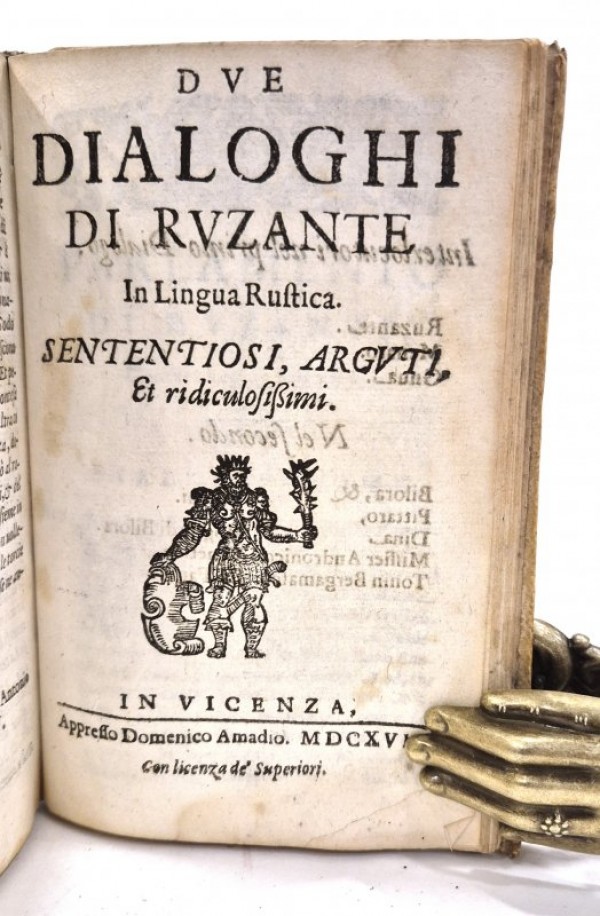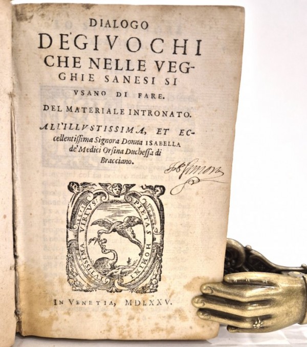 DIALOGO DE GIUOCHI CHE NELLE VEGGHIE SANESI SI USANO DI FARE. DEL MATERIALE INTRONATO. ALL'ILLUSTISSIMA, ET ECCELLENTISSIMA SIGNORA DONNA ISABELLA DE' MEDICI ORSINA DUCHESSA DI BRACCIANO. Unito a: DUE DIALOGHI DI RUZANTE IN LINGUA RUSTICA SENTENTIOSI, ARGUTI, ET RIDICULOSISSIMI.