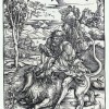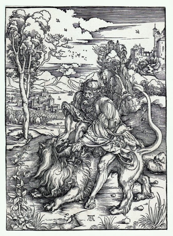 Silografia impressa su carta vergellata piuttosto spessa, priva di filigrana e databile all’ultimo quarto del sec. XVI. Monogramma posto al centro del bordo inferiore. Stato unico, terza o quarta variante su sette (Meder 107 c-d/g). Rifilata irregolarmente lungo la linea mar - ginale, sempre presente. Esemplare in buono stato di conservazione dalla vivida inchio - stratura; qualche leggera abrasione al verso degli angoli e alcune lievi pieghe di stampa o traccia di piegatura. STRAUSS 33 - A partire da questa stampa, Dürer ravviva il primo piano con un’ampia ve - getazione. … Sansone è a cavalcioni del leone e cerca di aprirne la bocca. Sebbene la resa di Dürer rappresenti un notevole progresso rispetto alle precedenti, la posizione di Sansone ri - mane poco convincente. Mentre spinge con il piede destro contro il collo del leone, la sua gamba sinistra è inerte invece di spingere indietro contro il terreno. Questa silografia è stata spesso considerata l’opera complementare a Ercole conquista i gemelli Molionidi. La qualità realistica del leone è stata collegata al fatto che Dürer aveva avuto modo di conoscere i leoni a Venezia, sebbene potessero essere semplicemente quelli scolpiti nella pietra a San Marco. Woodcut on rather laid thick paper, without watermark, datable to the quarter end of the 16th century. Monogram at the centre lower edge. Meder 107 c-d/g. Irregular trimmed just inside the platemark, always present. Good state, sharply contrasts; some light abra - sions on corners “on verso” and some slight printing creases or trace of folding. STRAUSS 33 - Beginning with this print Dürer enlivens the foreground with ample ve - getation. … Samson is straddling the lion and attempting to force apart the mouth of the beast. Although Dürer’s rendering represents a considerable advance over the earlier ones, Samson’s stance remains unconvincing. While he is pushing with his right foot against the neck of the lion, his left leg is limp instead of pushing back against the ground. This woodcut has often been viewed as the companion piece to Hercules Conquering the Mo - lionide Twins. The lifelike quality of the lion has been linked to Dürer’s having become acquainted with lions in Venice, although they may have merely been the ones carved in stone at St. Mark’s.
