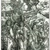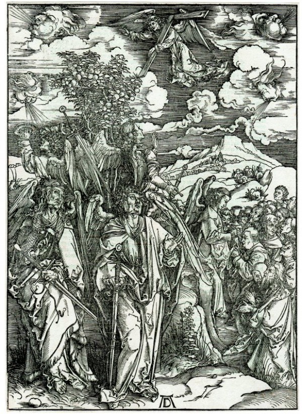 Silografia impressa su carta vergellata, priva di filigrana e con testo latino al verso per l’edi - zione del 1511. Monogramma al centro del bordo inferiore. Terzo stato su quattro (Meder 169 III/IV). Margine di 3 o 4 millimetri oltre il bordolinea. Esemplare in ottimo stato di conservazione dalla nitida e forte inchiostratura. STRAUSS 52 - Dürer si è preso delle libertà con il testo e ha introdotto dettagli propri: gli angeli brandiscono spade; all’angelo che sale da oriente è stata data la Croce da portare attraverso il cielo; un altro angelo è raffigurato mentre marchia con i sigilli i servi di Dio; e i quattro angeli non sono posti agli angoli della terra, ma composti in una possente pi - ramide. Chiaramente, il prominente melo, l’Albero della Vita, rimane intatto dai venti – come richiesto dal testo – ma i venti stessi sembrano aver sfidato l’artista a raffigurarli in uno stato di inattività, cioè senza raggi simbolici che escono dalle loro bocche. Tuttavia, le due teste superiori dirigono le loro brezze lontano dalla terra. Solo quella in basso a si - nistra riceve un avvertimento dall’angelo più vicino, che è pronto a colpire con la sua spada. Il calice sorretto dall’angelo ‘che sigilla’ presumibilmente simboleggia l’Eucaristia. Woodcut on laid paper, without watermark, with Latin text on “verso”, for the edition of 1511. Monogram on the lower centre edge. Meder 169 III/IV. 3 or 4 mm of margin be - yond the borderline. Excellent condition, vivid inking, strong contrasts. STRAUSS 52 - Dürer has taken liberties with the text and introduced details of his own: the an- gels wield swords; the angel ascending from the east has been given the Cross to carry across the sky; another angel is pictured as he marks with seals the servants of God; and the four angels are not placed at the corners of the earth, but compounded into a po - werful pyramid. Clearly, the prominent apple tree, the Tree of Life, remains untouched by the winds-as called for by the text-but the winds themselves seem to have defied the artist to depict them in a state of inaction, i.e., without symbolic rays issuing from their mouths. Still, the two upper heads do direct their breezes away from earth. Only the one at the lower left is receiving a warning from the angel nearest, who is poised to strike with his sword. The chalice held by the ‘sealing’ angel presumably signifies the Eucharist.