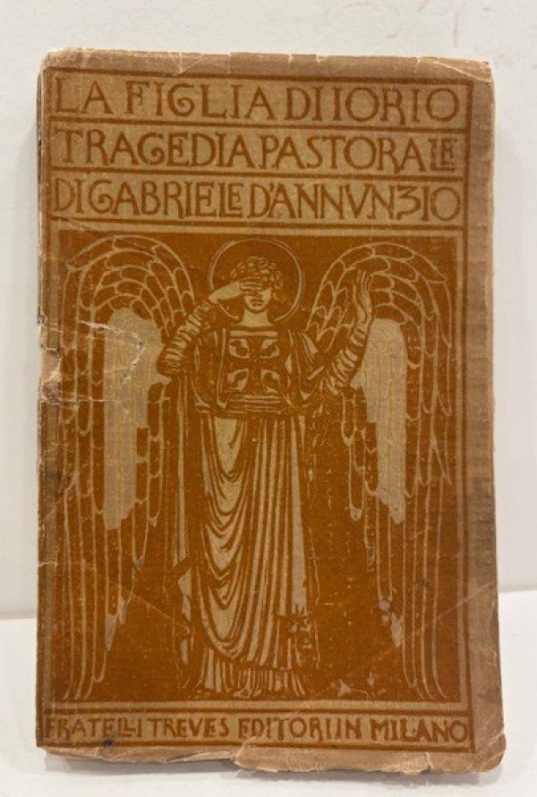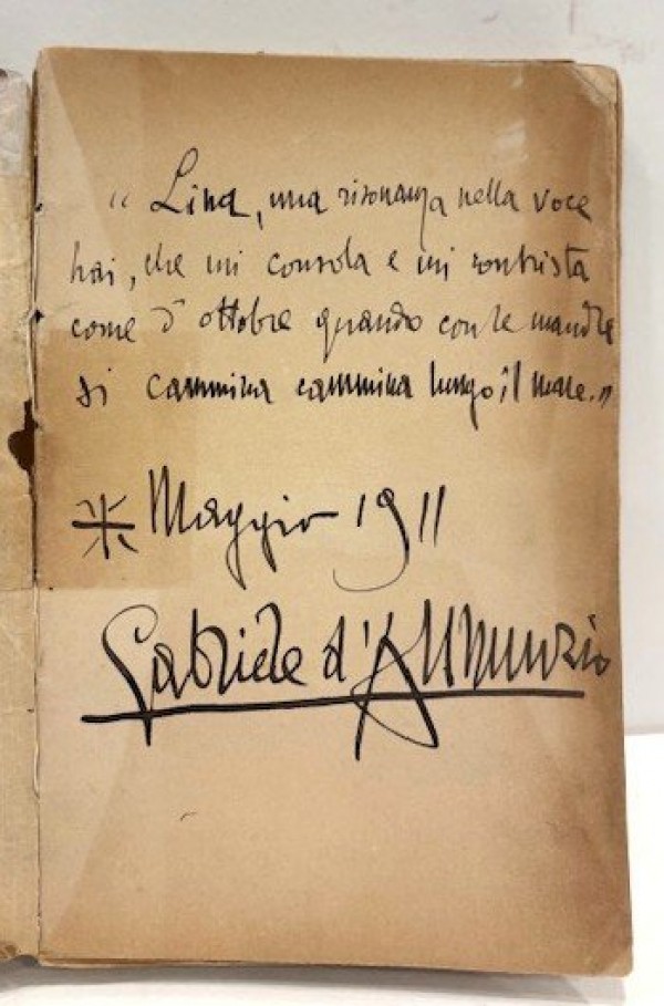 Legatura  in brossura editoirale con titolo e immagine al piatto anteriore e a quello posteriore  impressi in seppia. Al recto della prima carta, dedica autografa manoscritta di d'Annunzio: " Lina, una risonanza nella voce hai, che mi consola e mi contrista come d'ottobre quando con le man... si cammina cammina lungo il mare" Maggio 1911 Gabriele d'Annunzio. 166 pagine numerate; 6 pagine non numerate di cui 5 bianche. Prima edizione, sedicesimo migliaio della celebre tragedia pastorale suddivisa  in tre atti e in versi, venne rappresentata la prima volta al Teatro Lirico di Milano nel 1904, con Lyda Borelli nella parte di Ornella e Irma Gramatica nella parte di Mila di Codro, la figlia di Iorio.  La tragedia  trova ambientazione nelle campagne abruzzesi durante il  Medioevo e narra la storia di un pastore,  Aligi, e del suo amore  controverso con una donna, Mila, accusata di malaffare e stregoneria. Aligi uccide il padre a seguito del tentativo di quest'ultimo di stuprare Mila in segno di spregio per la donna invisa a tutti. Mila sava il malcapitato Aligi dalla forca, autoaccusandosi di averlo indotto al parricidio mediante un sortilegio. Mila viene così  condannata al rogo, compresa solo dalla sorella di Aligi che ha intuito la verità e la benedice. Esemplare in discrete condizioni, legatura con sciupature e piccole mancanze o crepe al dorso, interno lievemente allentato e ingiallito. Preziosa la dedica autografa di d'Annunzio.