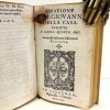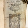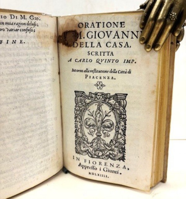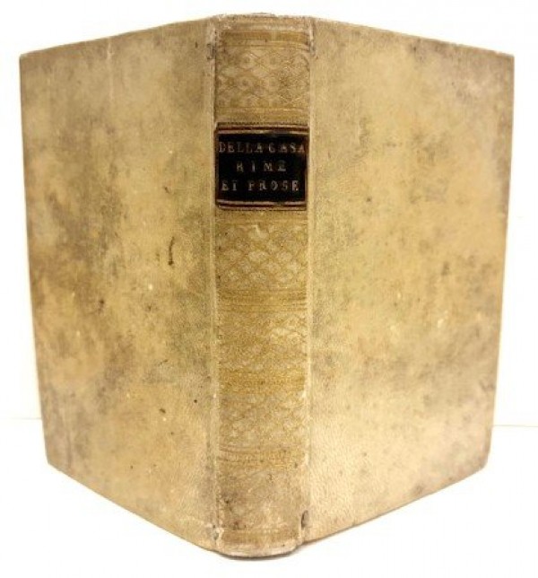 Legatura di inizio Ottocento in piena pergamena; al dorso, titolo in oro su tassello rosso, dipinto successivamente di colore bruno, eleganti fregi in oro agli altri scomparti. I parte: 15 pagine numerate compresi frontespizio, dedica a Mario Colonna, e Tavola delle Rime; 56 pagine numerate; due antiche note di possesso al frontespizio, di date diverse.II parte: frontespizio con bella marca tipografica " Di tutte le desinentie delle rime"da pagina 57 a 112 numerate; III parte: frontespizio con marca tipografica "Oratione di M. Giovanni della Casa scritta a Carlo Quinto sulla restitutione della città di Piacenza", da 113 a 142pagine numerate. IV parte: frontespizio con marca tipografica " Trattato di M. Giovanni della Casa.Galateo", da 143 a 246 pagine numerate. V parte: frontespizio con marca tipografica " Trattato degli Uffici Comuni"da pagina 247 a pagina 295 numerate. Seconda edizione in cinque parti, con nuove poesie, che non sono stati incluse nell`edizione del 1558. Testo fondamentaleè il proverbiale Galateo, " Trattato di Messer Giovanni della Casa, nel quale sotto la persona d"un vecchio idiota ammaestrante un suo giovanetto, si ragiona de modi, che si debbono o tenere, o schifare nella comune conversatione, cognominato Galatheo overo de Costumi". Scritto con eleganza di lingua, nonè solo un trattato di buone maniere, ma un compendio di insegnamenti morali e pratici dettati da una lunga esperienza e da una raffinata cultura, tanto da essere considerato un testo significativo dell"Umanesimo. Ebbe questo titolo perchè fu suggerito all"autore da Galeazzo (Galateo) Florimonte vescovo di Sessa. Anche il termine "idiota" (un uomo semplice, incolto) mostra il contrasto con Castiglione nel suo "Cortegiano" (1528). Esemplare in buone condizioni, salvo essere corto al margine superiore della prima parte con parziale taglio delle scritte superiori di intestazione, e per una macchia al frontespizio e pagina seguente dell`Oratione, pagina 112-113; alltrimenti in buone condizioni.