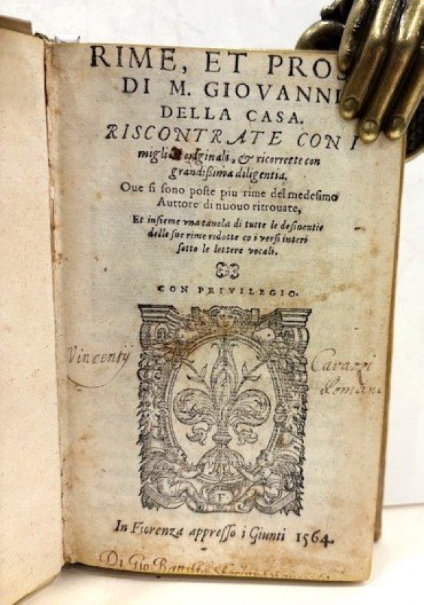 RIME, ET PROSE DI M. GIOVANNI DELLA CASA. RISCONTRATE CON I MIGLIORI ORIGINALI. ORATIONE DI M. GIOVANNI DELLA CASA SCRITTA A CARLO V. TAVOLA DI TUTTE LE DESIENENTIE DELLE RIME.TRATTATO DI M. GIOVANNI DELLA CASAS. GALATEO. TRATTATO DEGLI UFFICI COMUNI TRA GLI AMICI SUPERIORI. ET INFERIORI.